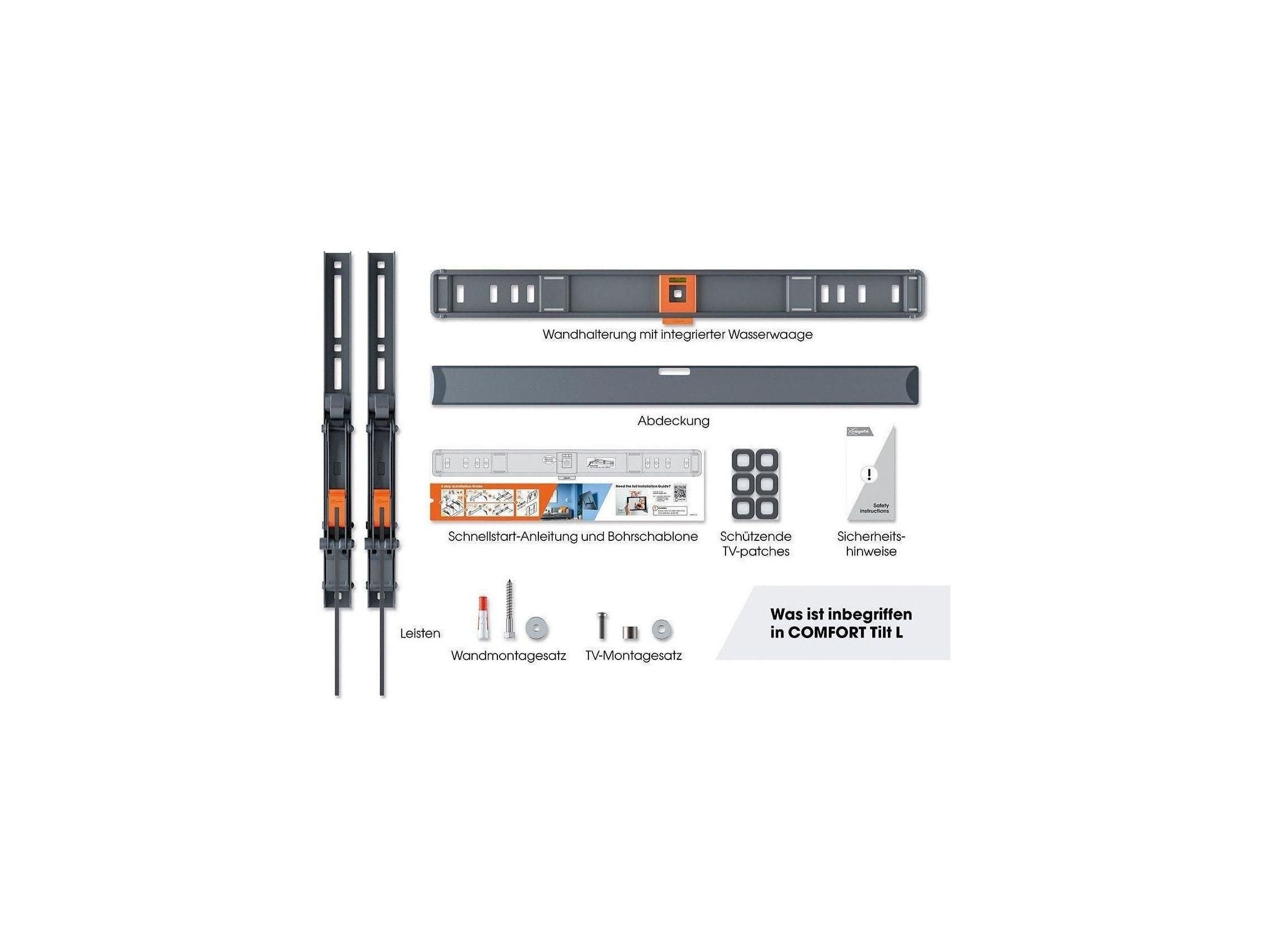 Die COMFORT Tilt TV-Wandhalterung lässt sich ganz leicht installieren. Und Vogel's hilft Ihnen noch weiter. Die Verpackung enthält nämlich auch eine Bohrschablone, Schrauben und DuoPower-Dübel von Fischer®. Mit unserer kostenlosen DrillRight app markieren Sie ganz einfach das erste Bohrloch. Die Wandhalterung verfügt außerdem über eine integrierte Wasserwaage, damit Ihr Fernseher auf jeden Fall gerade befestigt ist. Wie Sie alles installieren, erfahren Sie in der Kurzanleitung zur Installation. Eine detaillierte Anleitung finden Sie online, ebenso wie ein praktisches Installationsvideo.