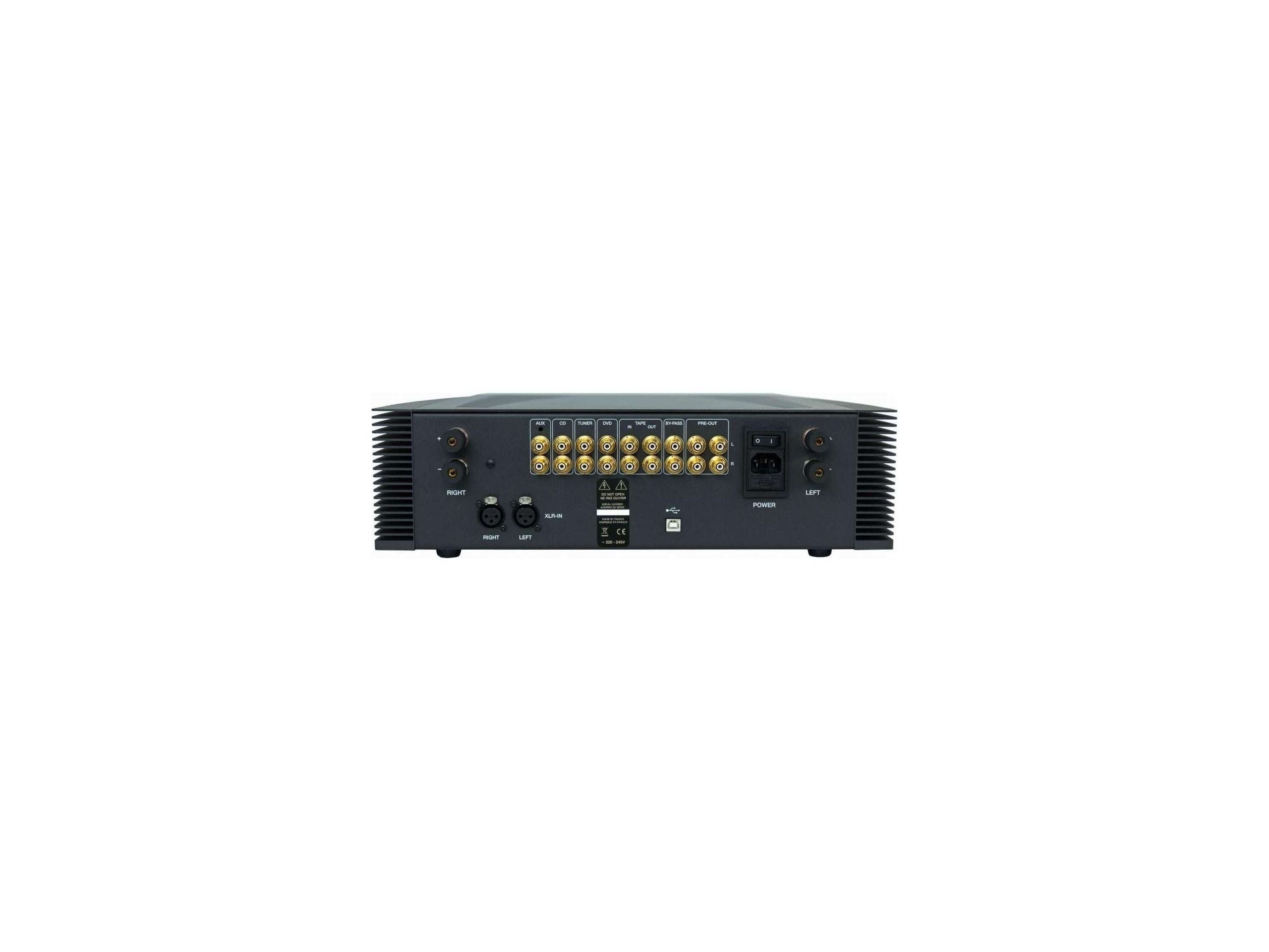 The playback devices - you can also connect one via balanced XLR connections - and the volume are selected using a rotary knob. The display provides all important status information. Seamless integration into multi-channel systems has also been ensured: the BY-PASS input bypasses the preamplifier and allows the IN400 SE to be used as a pure stereo power amplifier.
